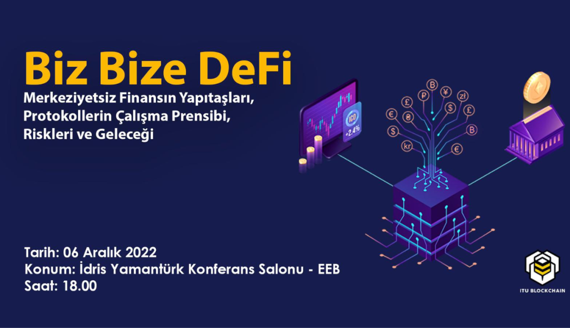 ITU Blockchain’in organizasyonunda gerçekleşen “Biz Bize” etkinlik serilerinde bu sefer “Biz Bize DeFi” etkinliği ile bizlerle. Etkinlikte DeFi dünyasında dair sorularınıza yanıt bulanabileceğiniz ve kullanım alanlarından geleceğine kadar birçok başlıkta DeFi’leri ele alınacaktır. “BİZ BİZE DeFi” 6 Aralık Salı günü 18:00 da gerçekleşecektir. Etkinlik adresi olarak EEB, Idris Yamantürk Konferans Salonu’nda gerçekleşecektir.