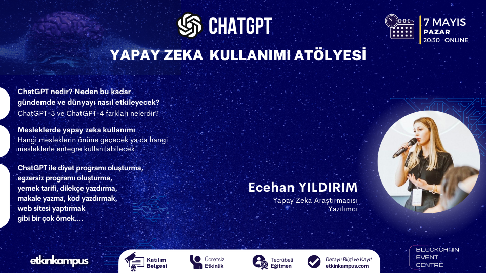 Herkesin son zamanlarda karşısına çıkan yapay zeka ChatGPT atölyesi ile karşısınızdayız. Bakalım mesleklerimizde ChatGPT’yi nasıl kullanacağız. Hayatımızı nasıl kolaylaştıracak.